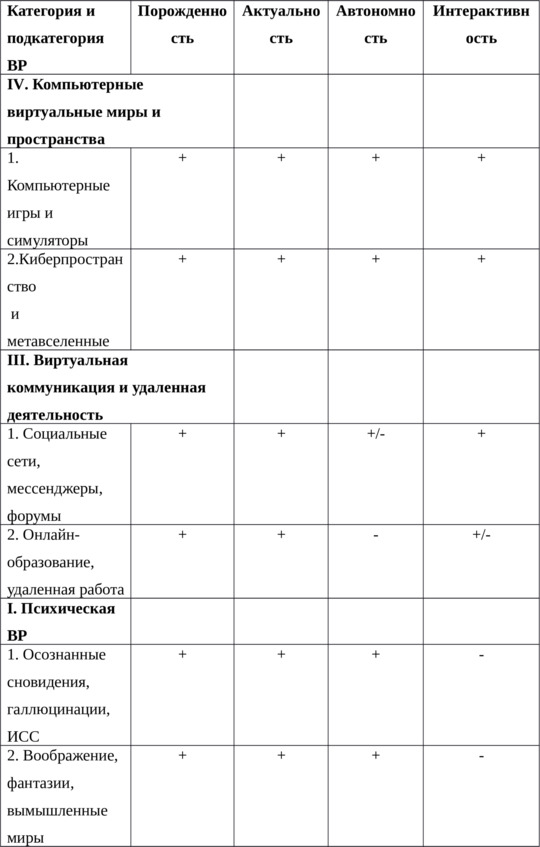 Отразив в сравнительной таблице 1 категории и подкатегории ВР и проанализировав на «настоящесть» согласно наличию необходимых свойств по Н. А. Носову, можно увидеть, что только компьютерные игры, симуляторы, киберпространство и метавселенные демонстрируют все ключевые характеристики ВР, которые выделял Н. А. Носов: порожденность, актуальность, автономность и интерактивность. Только цифровые миры обладают собственными законами, временем и пространством, позволяя пользователям активно взаимодействовать с виртуальной средой, что делает их автономными и независимыми от порождающей их физической реальности.
