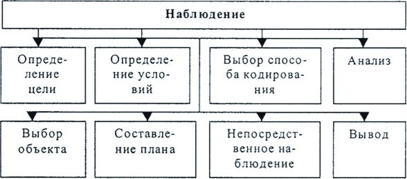 Наблюдение – научный метод исследования, переход от описания факта к описанию его внутренней сущности. Наблюдение заключается в последовательном и целенаправленном восприятии психических явлений с целью изучения их изменений в определенных условиях. Наблюдение всегда предполагает наличие замысла, системы методологических приемов контроля и осмысления результатов. Необходимые условия: четкий план наблюдения, фиксация результатов наблюдения, построение гипотезы, объясняющей наблюдаемые явления, и проверка гипотезы в последующих наблюдениях (рис. 2.2).