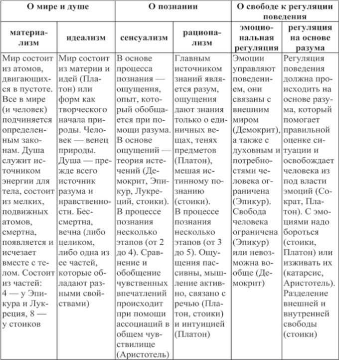 К обладателям высшей души философ относил людей и Бога. Бог обладает лишь разумной душой, а человек еще растительной и животной. Аристотель отвергал учение о переселении душ, но считал, что в душе есть часть, не возникающая и не подвергающаяся гибели. Эта часть – ум. За исключением ума, все части души подлежат разрушению, так же как и тело. Положения мыслителей Древней Греции сведены в таблицу, приведенную на рис. 3.4.