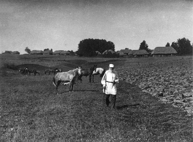 Л. Н. Толстой идет вдоль вспаханного поля около деревни Ясная Поляна. 1908. Фотография В. К. Черткова