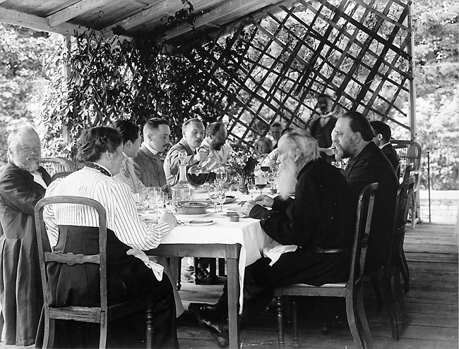 Фотография Т. Тапселя. Слева направо: Т. Л. и М. С. Сухотины, Е. П. Сухотина, Л. М. и С. М. Сухотины, П. Г. Дашкевич, Танечка Сухотина с няней, слуга Сухотиных, В. Ф. Булгаков, Д. П. Маковицкий, В. Г. Чертков