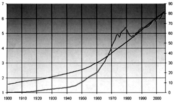 На протяжении всего исторического периода темпы роста глобального потребления энергии опережали темпы роста населения, увеличиваясь пропорционально квадрату числа жителей Земли Е ~ N2, то есть скорость роста потребления энергии в два раза превышала скорость роста населения. За 140 лет с 1850 по 1990 г., когда население Земли увеличилось в 4,3 раза, потребление энергии возросло в 17 раз (Капица, 1999). Особенно тесная корреляция роста населения и мирового производства энергоресурсов наблюдалась в течение последнего столетия (рис. 1).