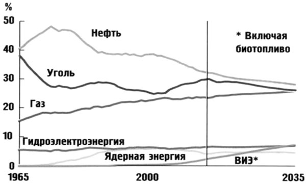 Из-за сокращения доступных ресурсов нефти ее доля в мировом энергобалансе будет постоянно снижаться, а доля природного газа – расти. Прогнозируется, что к 2035 г. вклад трех основных источников ископаемых энергоресурсов практически сравняется, достигнув уровня примерно по 25 % для каждого из них (рис. 5). То есть и через 20 лет на долю традиционных ископаемых источников будет приходиться не менее 3/4 производимой на Земле энергии. А по базовому сценарию МЭА доля ископаемых видов топлива и в 2050 г., несмотря на рост атомной энергетики и использование возобновляемых источников, будет составлять не менее 85 %, что может вызвать проблемы, связанные с энергетической безопасностью и ростом выбросов CO2 (Перспективы энергетических технологий…; 2007).