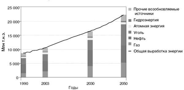 По прогнозам Международного энергетического агентства (МЭА) (Перспективы энергетических технологий…; 2007), общий объем потребления энергии будет расти в среднем на 1,6 % в год: с 10 579 млн тнэ в 2003 г. до 22 112 млн тнэ в 2050 г. (рис. 6). Это заметно ниже темпов роста мировой энергетики в 1971–2003 гг., составлявших в среднем 2,1 % в год, тем не менее по сравнению с началом века к его середине мировое потребление энергии удвоится.