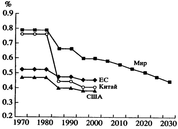 Учитывая обостряющуюся ситуацию с ископаемыми энергоносителями, их растущий дефицит и стоимость, а также обострение связанных с энергетикой глобальных экологических и климатических проблем, повышение эффективности использования энергоресурсов и снижение удельных затрат энергии на единицу производимой продукции становится ведущей тенденцией мировой энергетики. Например, США при постоянном росте ВВП в последние годы сумели практически стабилизировать потребление энергии. Это было достигнуто в основном за счет того, что за 40 лет было почти вдвое снижено удельное потребление энергии на единицу производимого в стране ВВП (рис. 9).