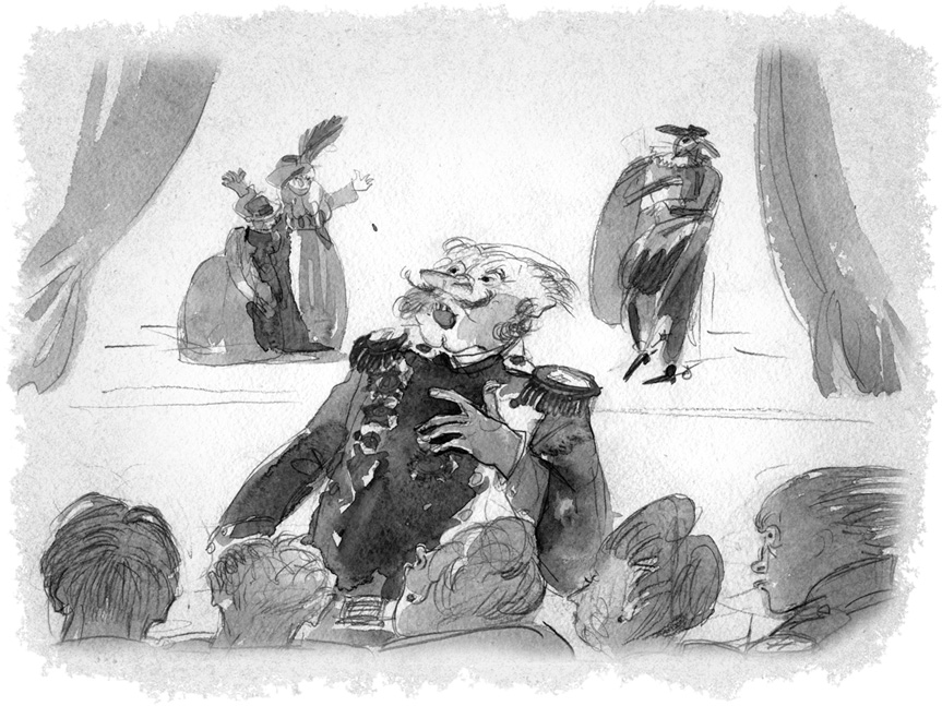 Согласно билету Бибиков разместился в литерном ряду, отчего вначале немного напрягся, так как люди, сидящие рядом, были сплошь в генеральских мундирах и сияющих орденах. Под стать им были и их жены. Все в бриллиантах и французской парфюмерии. Не успел Александр Петрович освоиться, как заиграл оркестр и началось действо. Поначалу оно забавляло и даже несколько увлекало его. Но к середине спектакля вторая волна алкогольного опьянения накрыла Бибикова. Вдобавок сидящая рядом толстая генеральша начала потеть и излучать жар, как голландская печь. Эта смесь потного тепла и обострившегося запаха духов окончательно ввела его в состояние транса. Перед ним замелькали лица поющих актёров, сановных особ, лысого полуспящего генерала с двойным подбородком, нафуфыренных дебелых дам… Лиц было много, и все они были разные – старые и не очень, блондины, брюнеты и даже рыжие. Но сквозь туман Бибиков вдруг ясно и отчётливо увидел, что есть в этих лицах одно еле уловимое общее. Всем им, сидящим в литерных рядах, абсолютно было все равно, как поют и играют актёры. Они пришли сюда не за этим. Им важно было быть в первых рядах. И пока они здесь, у них будет все: продвижение по службе, деньги, награды и другие прелести жизни. Перемещение в середину, а уж тем более на галёрку равносильно смертельному исходу.