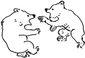 Холодная процедура действовала на них успокаивающе, и они сразу прекращали борьбу. Это повторялось несколько раз в день. Таким образом, медвежата проходили своеобразную закалку, которая должна была им пригодиться уже в первые дни после того, как семья медведей выйдет из берлоги. Ведь в конце марта и в первой половине апреля, когда медведица выводит своих детёнышей из берлоги, в лесу ещё лежит снег, а на проталинах стоят лужицы с ледяной водой.