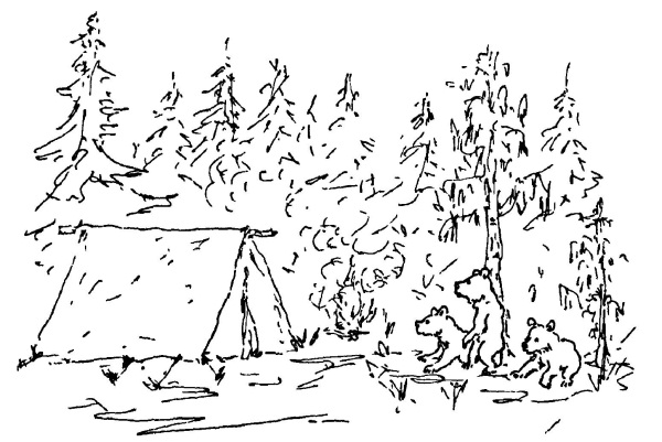 Проснулся от того, что кто-то ворочался у самого моего лица, пыхтел и упорно царапал клапан спальника. Решил отодвинуть пришельца, но познакомился с острыми когтями. Зажег фонарик. Нарушителем оказался Тоша. Не обращая внимания на появившийся в палатке свет, он упорно лез ко мне в мешок, совершенно точно определив, что в мешке будет теплее. Я никак не разделял его желаний, повернулся на бок, закрыл клапан спальника, и Тоше ничего другого не оставалось, как смириться со своей участью. Он улегся рядом и тут же мирно засвистел носом, время от времени вздрагивая во сне, как маленький ребенок. Утром обнаружилось, что все три медвежонка, сбившись в кучу, спят на углу спального мешка. Мое появление их не очень обеспокоило, но они отодвинулись в дальний угол палатки и уселись на мотке капроновой веревки.
