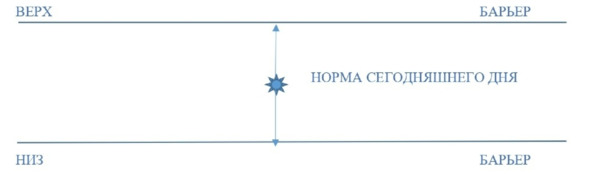 Мы видим, что на схеме мы имеем два барьера и где-то посередине мы имеем точку, которую мы можем обозначить как «норма сегодняшнего дня». Барьер сверху – это барьер энергии, который мы на сегодняшний день можем вывозить, имею в виду тот объём энергии, который идёт сверху вниз, через верхний энергоцентр, который задействует наши творческие способности, духовность человека, его речь, способность фантазировать, придумывать и создавать новое, небывалое. В свою очередь, нижний барьер – это нижний барьер энергии, который идёт снизу вверх, в наше тело, и мы можем выдерживать его на сегодняшний день. Нижний энергопоток идёт через нижний раздел, отвечающий за жизненность, размножение и выживание, физическую силу и природные инстинкты. Для того чтобы расширить наши границы и сдвинуть барьеры в сторону увеличения объёма энергии, нам необходимо приложить больше усилий для преодоления этих барьеров, нужно больше сил, чем для движения внутри этих барьеров. На сегодняшний день, если у человека есть проблемы с лишним весом и он начал заниматься спортом, например ходить, то, в случае если он начал проходить на 20—30% больше расстояния, чем он это делал вначале, это означает движение внутри барьеров, но если его вес начал приходить в норму, это означает, что энергетические барьеры начали расширяться и объём энергии начал увеличиваться. Но где брать силы для такого увеличения объёма энергии, чтобы преодолевать свои барьеры на физическом, энергетическом и психическом уровнях? В нашей психике или в наших внутренних источниках. Как ни странно, но есть всего два источника силы в нашей психике – это страх смерти или Энергия Любви. Страх – очень понятный и хорошо освоенный источник энергии, так как он имеет природу инстинкта самосохранения и частично инстинкта размножения. Желание дать потомство и защитить свой род, выжить, в конце концов, является понятным желанием любого живого существа. Этому источнику миллионы лет, но Энергия Любви не идёт ни в какое сравнение с силой страха смерти, потому что Любовь не является реакцией на внешние обстоятельства. Она намного сильнее страха, но проблема в том, что доступ к источнику Энергии Любви можно получить только в том случае, если человек полностью преодолел страх и контролирует своё сознание и состояние. Контроль своего сознания и состояния есть та нелёгкая задача, которую нам предстоит решить. Но это достойная цель, для того чтобы стать человеком радостным и любящим.
