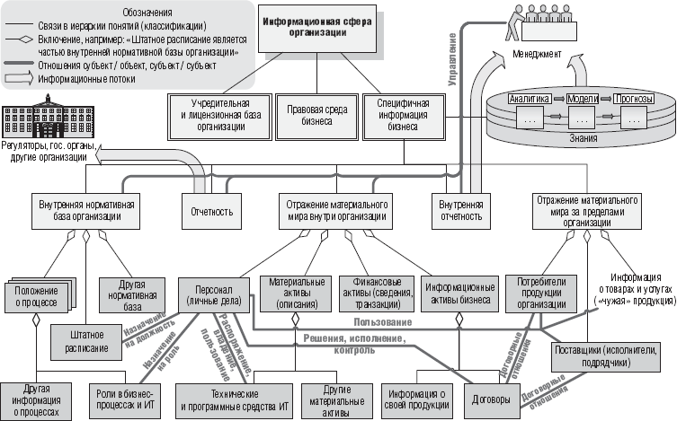 Существенная часть информационной сферы, относящейся к информации бизнеса, является просто отражением материального мира. Внутри организации это описание ее активов, отношений и их типов, данные мониторинга бизнес-среды и собственной среды и др. Например, материальные и финансовые активы и их движение учтены в базах данных бухгалтерии и складов, персонал также учтен в базах данных бухгалтерии (зарплата, командировочные и др.) и отдела кадров (личные дела, графики отпусков, результаты оценок исполнительской деятельности и др.). Технические и программные средства, инструменты, используемые в информационных технологиях организации, учитываются, как правило, в базах данных конфигурационных единиц. Материальная ответственность работников за используемые в производстве средства и материалы также зафиксирована в соответствующих базах. Отношения работников зафиксированы в иерархической структуре организации (штатное расписание) и в виде функциональных обязанностей ролей и взаимодействий, определенных для реализуемых организацией технологических процессов, сервисов, услуг.