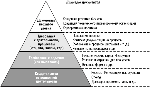 Внутренняя нормативная база организации имеет иерархическую структуру, вариант которой показан на рис. 5. Высокоуровневые документы определяют общую политику организации по разным вопросам. Положения, определенные в документах верхнего уровня, раскрываются и детализируются в ряде документов нижних уровней, воплощаясь в конкретные требования, регламенты и т. п. Самый нижний уровень документов – свидетельства выполненной деятельности – определяет возможности по контролю деятельности организации в целом, ее составных частей и персонала.