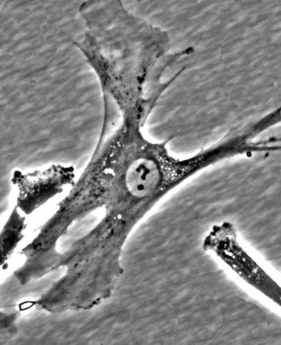 Это фотография живой мезенхимальной стволовой клетки, выделенной из костного мозга человека (фотография сделана автором статьи). Рядом с ней – отростки соседних клеток.