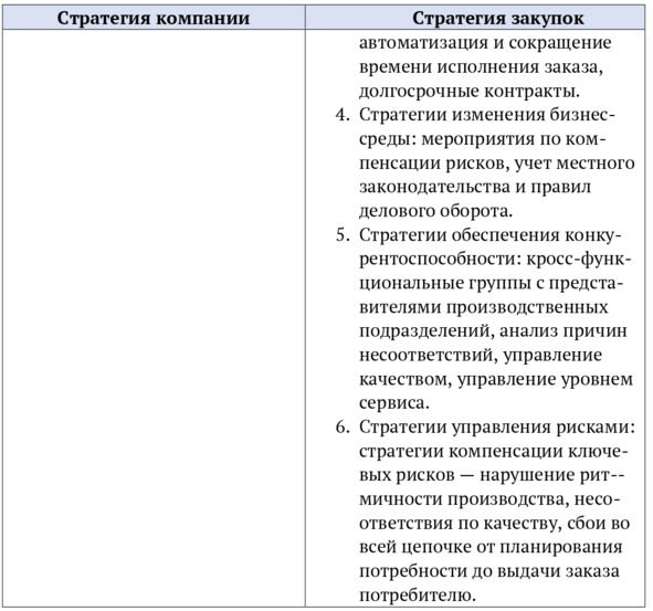 Очевидно, что стратегия закупок как одна из функциональных стратегий должна соответствовать стратегии компании. Для удобства можно описывать стратегию закупок по шести направлениям, приведенным в предыдущем разделе. Для формирования стратегии закупок можно использовать стратегическую карту, как показано для примера в таблице 1.