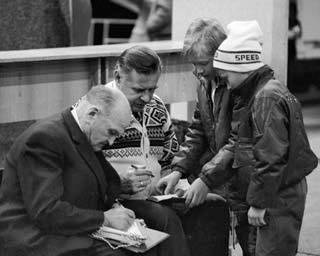 Выдающиеся футболисты-динамовцы С.С. Ильин (слева) и Л.И. Яшин дают автографы юным спортсменам