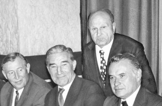 1986 г. Выдающиеся футболисты и тренеры Советского Союза, заслуженные тренеры СССР и заслуженные мастера спорта СССР (слева направо): Михаил Якушин, Андрей Старостин, Константин Бесков на юбилее Сергея Ильина (стоит)