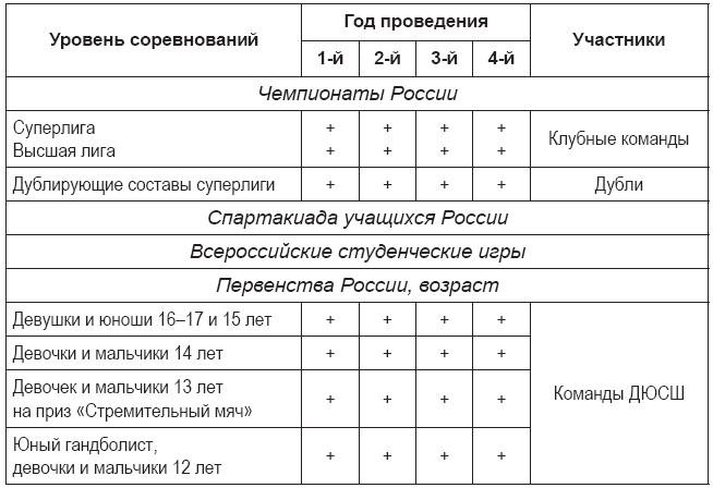 Система международных и российских соревнований в четырехлетнем цикле представлена в табл. 2 и 3, однако современные гандболисты участвуют и в так называемых коммерческих соревнованиях. Эти турниры или отдельные матчи позволяют улучшить материальную базу игроков и команды в целом.