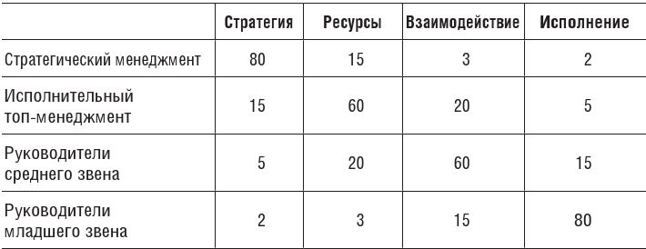 В идеальном варианте, который обеспечит максимальную эффективность использования человеческого ресурса компании, основное количество «процессорного времени» менеджера начального звена должно отводиться обеспечению работоспособности его сотрудников. Среднее звено должно решать вопросы координации. Исполнительный топ-менеджмент – разрабатывать, внедрять и контролировать схемы распределения ресурсов. Ну а владельцы и советы директоров – выбирать эффективные рыночные ходы и решать другие стратегические вопросы.