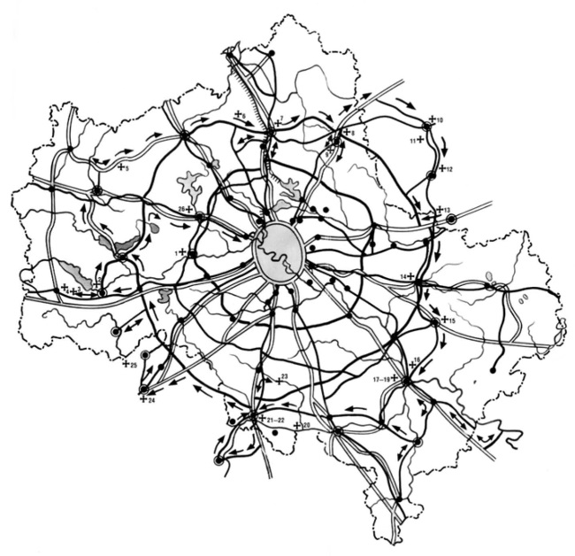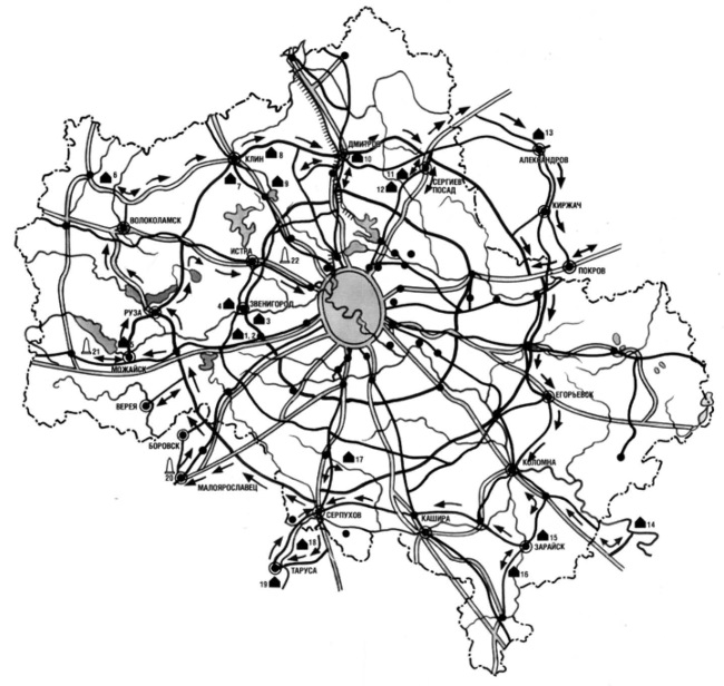 На карте-схеме показаны историко-культурные достопримечательности ближнего Подмосковья. Стрелками обозначены маршруты движения. Поименованы лишь древние города Подмосковья. Другие условные обозначения: