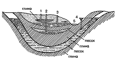 Схема залегания подземных вод: 1 – верховодка; 2 – межпластовые безнапорные воды; 3 – грунтовые воды; 4 – межпластовые напорные воды;
