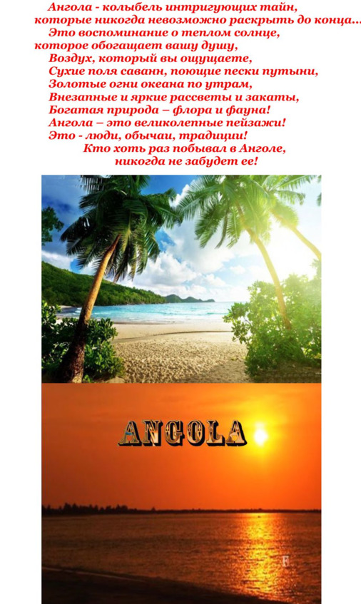 Сегодня об Анголе написано много научно-популярных и художественных книг, монографий, статей. А в Интернете каждый, уважающий себя путешественник, заводит свой личный блог (ЖЖ – Live Journal), в котором активно делится наблюдениями, впечатлениями от поездок, опытом, иллюстрируя свои рассказы яркими, колоритными фотографиями и видеосюжетами.