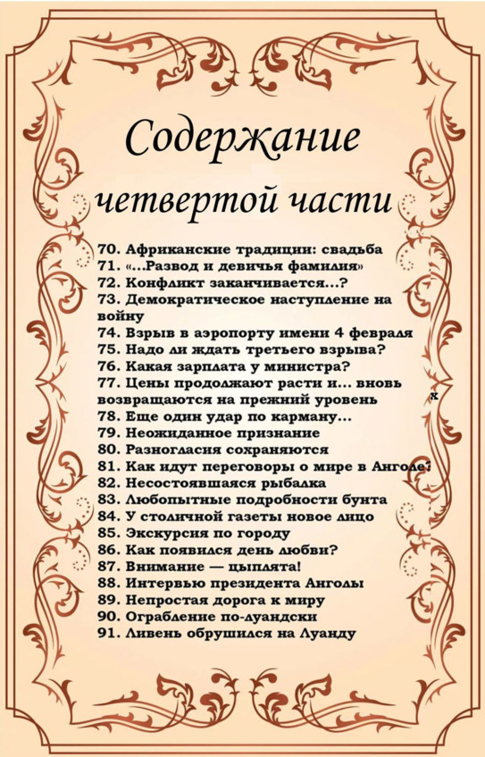 Повторюсь, в том виде, в котором изначально была написана книга, она представляла собой последовательное изложение в хронологическом порядке событий из общественно-политической жизни этой воюющей африканской страны, быта советских «колонистов», зарисовки из жизни простых ангольцев. Как таковой, единой сюжетной линии не было, каждая глава представляла собой отдельный эпизод, формирующийся вокруг одного события, одной проблемы, одного конфликта. Я описывал те события, которые происходили со мной или вокруг меня.