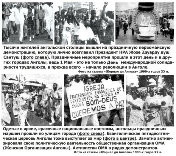 Первомай в Анголе празднуется так же шумно и весело. Нам даже показалось, что мы находимся не в далекой африканской стране, а у себя на Родине. Накануне Луанду украсили флагами, красочными транспарантами. А утром 1 Мая все вышли на праздничную демонстрацию. Людские реки потекли по улицам столицы, сливаясь в одну огромную – на набережной имени 4 Февраля. Праздничную колонну демонстрантов лично возглавил Президент НРА Жозе Эдуарду душ Сантуш. Он не принимал поздравлений народа с трибуны, как это делали наши государственные и партийные руководители, стоя на трибуне мавзолея.
