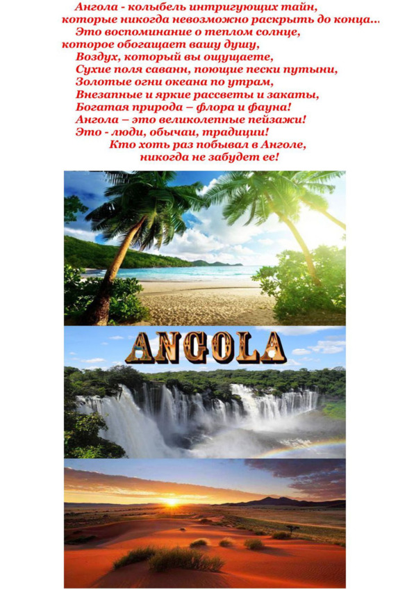 1. Ангола – небольшое африканское государство, которое расположено на юго-западе Центральной Африки. Полное официальное название страны – Республика Ангола. Ангола – 23-я самая большая страна в мире. Она в два раза больше Техаса. Численность населения по результатам последней переписи (2014 года) – 25,8 млн. человек.