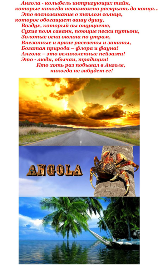 Сегодня об Анголе написано много научно-популярных и художественных книг, монографий, статей. А в Интернете каждый, уважающий себя путешественник, заводит свой личный блог (ЖЖ – Live Journal), в котором активно делится наблюдениями, впечатлениями от поездок, опытом, иллюстрируя свои рассказы яркими, колоритными фотографиями и видеосюжетами.