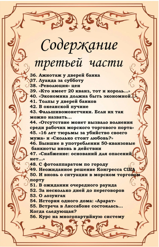Повторюсь, в том виде, в котором изначально была написана книга, она представляла собой последовательное изложение в хронологическом порядке событий из общественно-политической жизни этой воюющей африканской страны, быта советских «колонистов», зарисовки из жизни простых ангольцев. Как таковой, единой сюжетной линии не было, каждая глава представляла собой отдельный эпизод, формирующийся вокруг одного события, одной проблемы, одного конфликта. Я описывал те события, которые происходили со мной или вокруг меня.