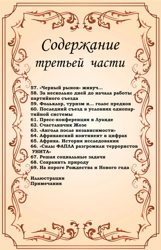 Свое второе рождение книга получила в начале 2000-х годов, когда у меня появился доступ в Интернет. В рукописи все больше стали появляться ссылки, комментарии, дополнения, сноски. С годами материал «старел», переставал быть современным и актуальным. Пришлось менять стиль изложения. Книга из «домашней», преимущественно исторического содержания, превратилась в страноведческую, географическую, научно-популярную, этнографическую. Кроме того, я расширил хронологические рамки и мне стало легче «перескакивать» из 90-х годов XX века в век XXI-й и обратно. Так родилось ее нынешнее название – «Ангола: Путешествие во времени». Рабочий вариант назывался очень длинно, просто и скучно: «Ангольские записки (из дневниковых записей дежурного коменданта торгового представительства СССР в Народной Республике Ангола 1990 – 1992 гг.)».