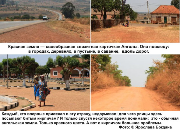 Еще с воздуха мы обратили внимание на странный цвет почвы вблизи аэропорта – кирпично-красный. Вначале мы подумали, что он характерен только для какого-либо определенного района и связан с деятельностью человека (например, добыча красной глины). Но чем дальше мы отъезжали от аэропорта, тем больше убеждались: этот краснозем14 – вполне естественный цвет почвы для всей Луанды.