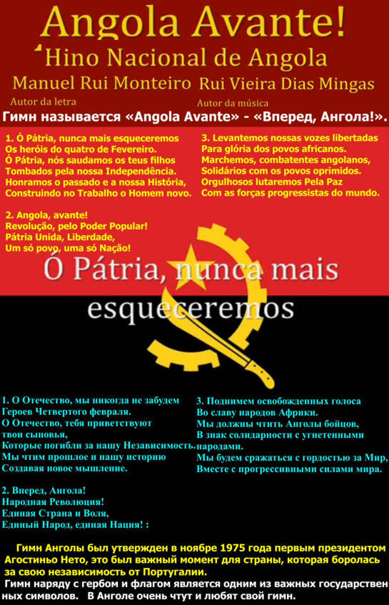 Несомненно, культура Анголы, также имеет свои, присущие этому африканскому народу, богатые традиции, уходящая своими корнями в период античности, тем не менее, она еще не успела сформироваться до европейского уровня. Люди, лишенные высокоразвитой нравственной базы, культивировавшие культуру протеста против нещадного гнета португальских колонизаторов, остались теми, кем были – «экспроприаторами всех ценностей», которых никогда не имели самостоятельно.