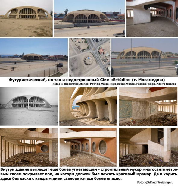 Но данный футуристический объект так и не был закончен, а потому заброшен. Поэтому сегодня стоит он одиноко на пустынной площади всего в 100 метрах от зданий администрации провинции Намибе (Governo Provincial do Namibe), партийного штаба МПЛА и министерства финансов провинции.
