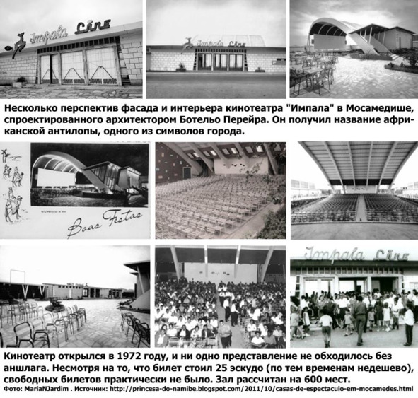 «Cine «Impala», с залом на 600 человек, спроектированный архитектором Botelho Pereira, получил название от африканской антилопы, которая является символом города Намибе.