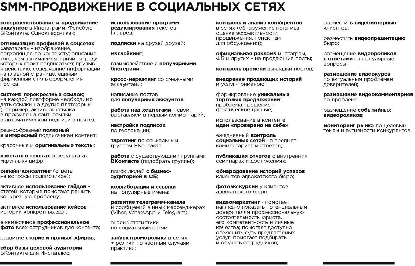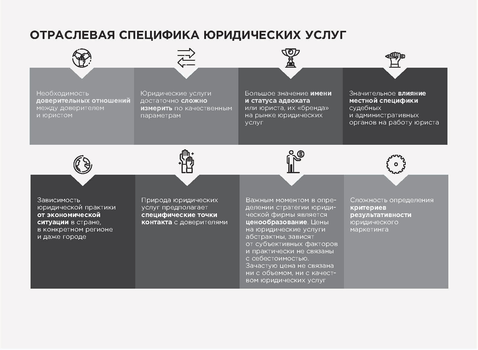 Практика маркетинга предлагает многообразие маркетинговых мероприятий и инструментов, которые адвокатское бюро может использовать в целях увеличения продаж своих услуг. При этом очевидно, что залог успеха кроется в их комплексном и системном использовании.