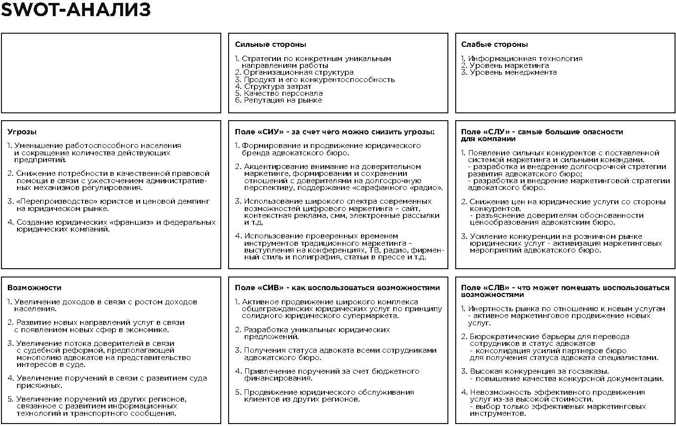 С точки зрения маркетинговой стратегии юридических компаний речь чаще всего идет о необходимости формирования юридического бренда, доверительном маркетинге, «сарафанном радио», системе обратной связи с доверителями, цифровом маркетинге, SMM-продвижении и традиционных инструментах, проверенных временем. В настоящей работе автором рассмотрены многочисленные конкретные мероприятия, которые осуществляет и планирует осуществлять адвокатское бюро в целях увеличения продаж своих услуг, а также особенности их реализации.