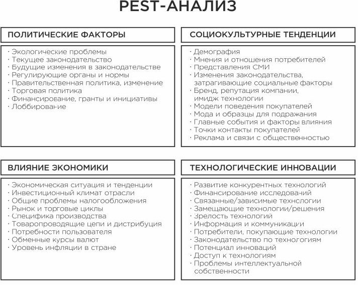 Матрица STEP-анализа представляет из себя таблицу, разделенную на графы: группа факторов, в каждой из этих групп излагаются сами факторы, их проявление и возможные действия компании, направление на предотвращение или минимизацию потерь от их негативного проявления. Все факторы подлежат балльной оценке, отражающие степень влияния или значимости каждого из них для данной организации. В связи с тем, что для одних компаний важнее одна группа факторов (например, социальная), а для других другая (например, политическая), то данный вид анализа имеет различные названия: STEP и PEST соответственно, в которых или один, или другой фактор выходит на первое место[27].