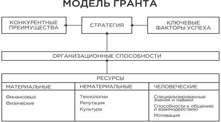 Грант стал известен методом, дающим возможность оценить в перспективе ресурсы и характеристики компании, его еще называют матрицей мощи ресурсов и характеристик / важности. Анализ проводится по двум базовым критериям – степени важности ресурсов и характеристик компании относительно друг друга, а также по критерию прочности положения фирмы с точки зрения ресурсов и характеристик относительно конкурентов. Среди ресурсов рассматриваются принимающие участие в производстве продукции материальные, нематериальные и людские активы компании. Под характеристиками подразумеваются варианты применения и размещения имеющихся ресурсов в компании.