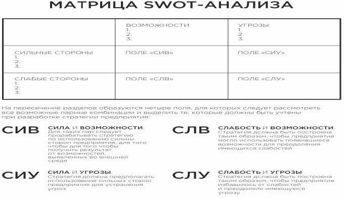 SWOT-анализ, обобщая вышеуказанные исследования внешней среды, позволяет определить возможности, которые могут использоваться организацией для развития, а также угрозы, к которым необходимо готовиться, разрабатывая подходящие стратегии на основе сильных и слабых сторон.