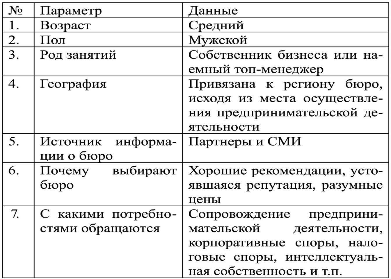 Первый – это мужчина средних лет, построивший свой бизнес или достаточно долго управляющий бизнесом по найму, человек с большим опытом управления и знания жизни, всегда ищущий оптимальный путь решения возникающих проблем, понимающий, что знание и правильное применение закона однозначно выгодно, предпочитающий работать с профессионалами, зарекомендовавшими себя в своей среде, желающий решить свои проблемы с минимальными расходами, но при этом отдающий отчет, что высококлассные услуги не могут стоить дешево. Узнает об адвокатском бюро он преимущественно от партнеров по бизнесу, из СМИ.