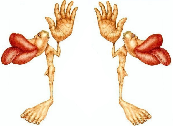 Моторная кора воспринимает руки, губы и язык огромными, не такими как в действительности. Причина такого представления в отличии размеров и плотности моторных рецепторов. Сигналы поступают в сенсорную кору из таламуса. Сенсорная кора занимает заднюю сторону центральной борозды и также переходит на боковую борозду мозга. Пути поверхностной и глубокой чувствительности заканчиваются на этой области теменной доли головного мозга. Сенсорный гомункулус, является отображением тактильных ощущений – касания, боли, вибраций и давления. Тактильные ощущения не одинаковы по причине разного размера и плотности рецепторов, воспринимающих их. Кроме того, руки, язык и губы на схеме сенсорной коры отличаются внушительными размерами. Соматосенсорная система, является системой кожной и костно-мышечной или проприоцептивной чувствительности, обеспечивающей наличие тактильных, температурных, ощущений боли и чувств пространственного расположения тела.