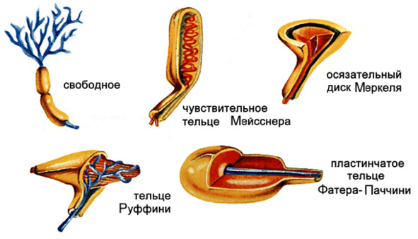 Расширение нервной терминали в области базального слоя эпидермальных гребешков и бороздок формирует комплекс с осязательным овальным тельцем – клеткой Меркеля. Вся эта «система» медленно адаптируется. При длительном давлении, к примеру, ношении браслета или кольца, эти комплексы бесконечно могут порождать нервные импульсы. Система «нервная терминаль+клетки Меркеля» отлично распознает края предметов, которые человек держит в руке длительное время.