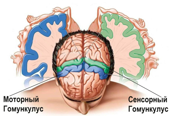 Гомункулус Пенфилда и его представительство, в коре больших полушарий.