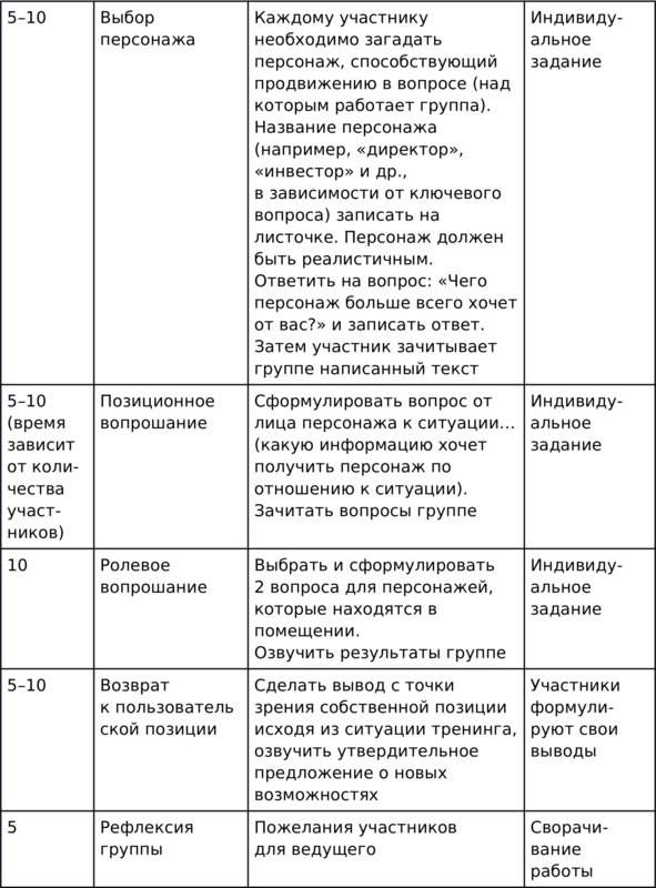 Идея этой тропинки в том, чтобы, во-первых, разобраться, какие вопросы наиболее привычны для вас при анализе ситуации и принятии решения, а во-вторых, попробовать задавать непривычные для вас вопросы и посмотреть, какие из них окажутся для вас наиболее эвристичными. Одним из способов расширить свой репертуар вопросов является позиционное вопрошание, которое описывалось в тропинке 4 (техника «Бизнес-планерка»). Другой способ, который мы предлагаем, это сравнение своих вопросов с вопросами, которые задают другие.
