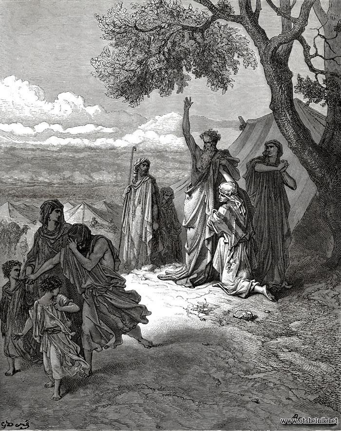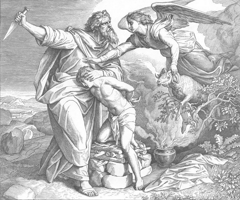 Бог сказал Авраму, чтобы он взял своего любимого сына Исаака, пошел в землю Мориа и там принес сына во всесожжение. Аврам послушался, взял сына, дрова, огонь и нож, пришел на указанное место, сделал жертвенник, связал сына, положил на дрова и занес нож: «И простер Аврам руку свою, и взял нож, чтобы заколоть сына своего» (22:10). Но тут услышал голос ангела, чтобы он не делал этого, а затем увидел барана в кустах и принес его на всесожжение. Опоздай ангел, точно бы зарезал сына!
