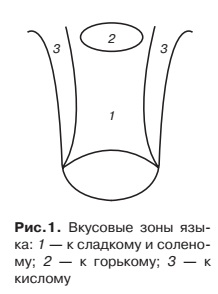 Для позвоночных животных характерна зависимость между способом питания и распределением рецепторов, а также их числом. У большинства животных органы вкуса расположены в полости рта – у рыб 20 тыс. вкусовых луковиц, у пресмыкающихся – около 200 тыс., у птиц – от 50 до 400 тыс., у млекопитающих – до 2 тыс. Вкусовые луковицы, или почки у всех позвоночных построены практически одинаково и сосредоточены во вкусовых сосочках языка, которые у всех млекопитающих бывают трех видов: грибовидные сосочки, чувствительные к сладкому и соленому, расположены ближе к кончику языка; вальковатые или желебоватые сосочки, преимущественно воспринимающие горький вкус, расположены у корня языка; листовидные сосочки, расположенные по краю языка, чувствительны к кислому и соленому. Зоны, воспринимающие вкусовые ощущения, перекрываются, поэтому, воздействуя на любую область, можно получить соответствующее восприятие, но при этом требуется значительно большая концентрация. Например, для ощущения сладкого вкуса с корня языка требуется воздействие на него раствором большей концентрации, чем для кончика языка. Средняя часть языка вообще лишена вкусовой чувствительности (рис. 1).
