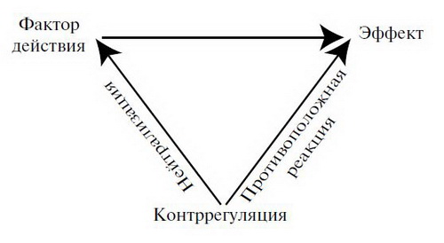 В фармакологии хорошо изучены закономерности доза-эффект, т. е. количественные и качественные особенности действия лекарственного препарата в зависимости от дозы. В то же время мы практически ничего не знаем о закономерностях и количественной зависимости реакции противодействия лекарственному веществу (как агенту, чужеродному для организма) в зависимости от вводимой дозы препарата и вызванного им эффекта. Мы назначаем фармакологические средства без учета реакции контррегуляции и не используем их в терапевтических целях.