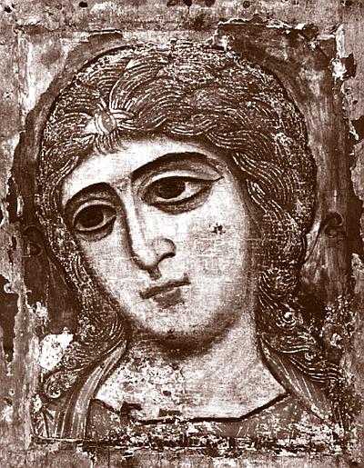Икона Архангела Гавриила из деисусного чина (Ангел Златые власы). Новгород. Дерево, темпера. 48,8 х 39 см. 2-я пол. XII века (Русский музей, Санкт-Петербург)