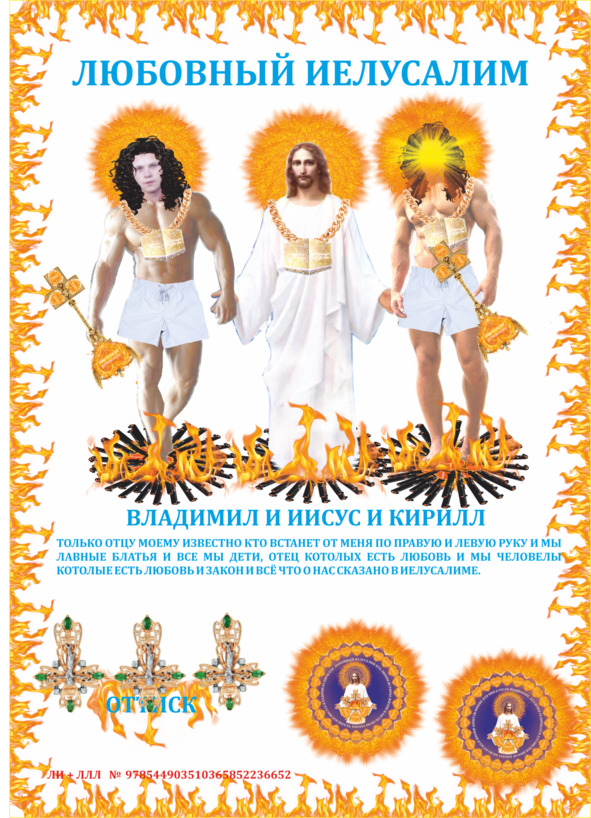 И вот Иисус делжит в луках огненную библию и читает и судит и огненная библия есть законный документ любовного Иелусалима и включает и состоит из 8 глав и они же есть 8 книг опечатанная 2 лючатями любовного Иелусалима и никому не дано снять эти лючати: