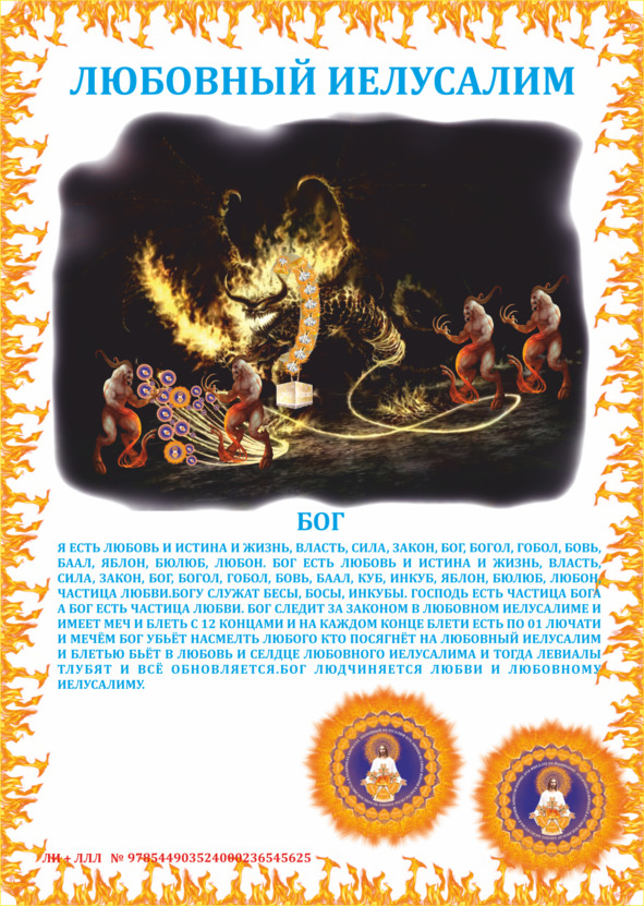 И вот Иисус делжит в луках огненную библию и читает и судит и огненная библия есть законный документ любовного Иелусалима и включает и состоит из 8 глав и они же есть 8 книг опечатанная 2 лючатями любовного Иелусалима и никому не дано снять эти лючати: